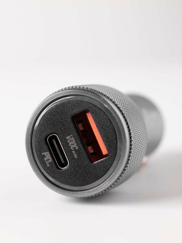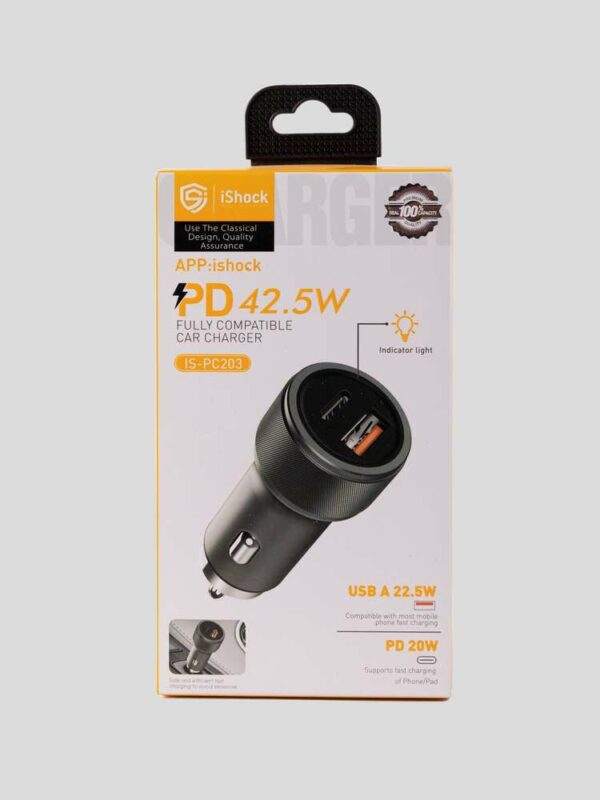 شاحن سيارة بسرعة شحن 42.5W مدخلين شحن USB 22.5W + PD 20W يدعم جميع أجهزة موبايل ويدعم الشحن السريع جدا